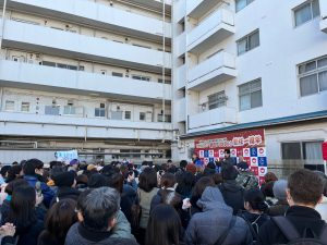そこから嵐のような毎日がスタートしました。翌日には神奈川2区の県市会議員が集合して今後の対応を検討し、1/17の朝に菅さんの引退会見をセッティングすることで調整します。更に、自分が支部長を務める自民党南区連合支部も早急に役員会を開き、菅さんの後継者を承認してもらう必要があります。衆議院は1/23解散、衆院選は1/27公示、2/8投開票という類を見ない短期決戦が既成事実となったからには、もはや一刻の猶予もありません。結局17日は、朝8時から菅さんの引退報告会及び記者会見、その後9時30分から支部の役員会というハードスケジュールになりました。そして迎えた1/17の早朝、我が地元南区の会見場周辺は、過去に見たこともない人数のマスコミと警察官で埋め尽くされました。ピリピリとした緊張感の中、夫人とともに会場に現れた菅さんは、近年見たこともないような穏やかな表情でした。「政治は新しい時代を迎えた。後進に道を譲るのは今だと決断するに至った。」「30年間で連続10回の当選、長年支援していただいた皆様には心から感謝している。」淡々と語る菅さんの一言一言が胸に染みます。こらえきれずに嗚咽する支援者の方も複数いらっしゃいました。そして最後に「後継者に指名した新田章文は、将来の日本を託すことが出来る人物だが全く知名度がない。だから今回の選挙は、菅の11回目の選挙だと思って戦って欲しい」。この一言で、会場に集まった支援者や地元議員の気持ちは完全に一つになりました。
