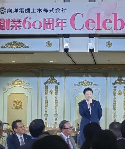 その他トピックスとしては、私が心の底から頼りにしている後援会副会長の倉澤敏郎さんが社長を務める向洋電機土木(株)が倉業60周年を迎え、盛大に祝賀パーティーが開催された事をご紹介したいと思います。向洋電機さんは電気設備工事の施工を主な業務として、横浜を中心に地域に根差した堅実な仕事で実績を重ねてきた我が地元の優良企業です。特に倉澤さんが三代目の社長になってからは、会社の業績だけでなく従業員の方々への配慮や地域への貢献が素晴らしく、ここ数年で行政から多くの表彰もされたと記憶しています。また外国人材の雇用にも積極的で、まさに中小企業の鏡と言っても過言ではない(ちょっと褒めすぎかもしれませんが…)会社です。だだ、仕事から離れたオフは、本当に『楽しいおじさん』でゴルフや飲み会では賑やかに仲良くやらせていただいています。そんな倉澤さんの会社の倉業60周年パーティー。ゲストのMr.シャチホコのステージも最高でした。政界からの参加は自分だけでしたが、笑いあり涙ありのアットホームで素敵なパーティーでした。地域の元気は、まさにこうした企業が担っています。これからも地域経済の先頭に立って行って欲しいし、自分は応援団としてがんばらなきゃ、とあらためて思いました。